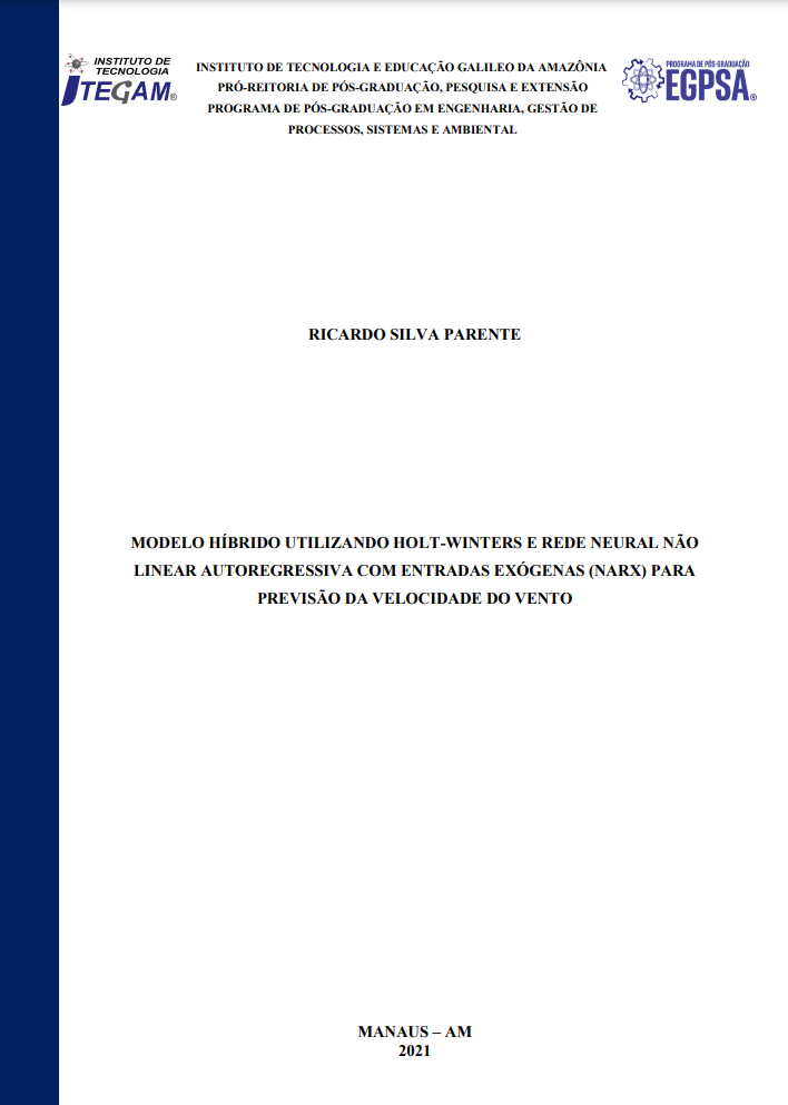 PARENTE, Ricardo Silva. Modelo híbrido utilizando holt-winters e rede neural não linear autoregressiva com entradas exógenas (narx) para previsão da velocidade do vento. 2021. p. 120. Dissertação do Programa de Pós-Graduação em Engenharia, Gestão de Processos, Sistemas e Ambiental (PPGEGPSA), Instituto de Tecnologia e Educação Galileo da Amazônia (ITEGAM), Manaus, 2021.